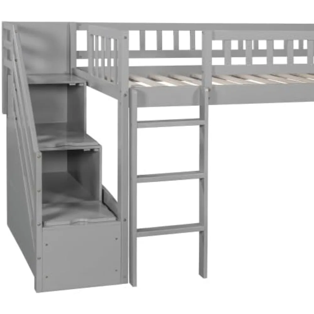 Twin Size Wooden Loft Bed with Built-in Ladder, Grey